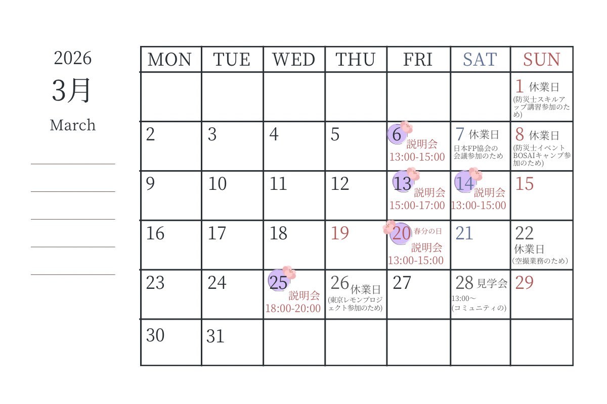 2026年3月の弊社の予定です。